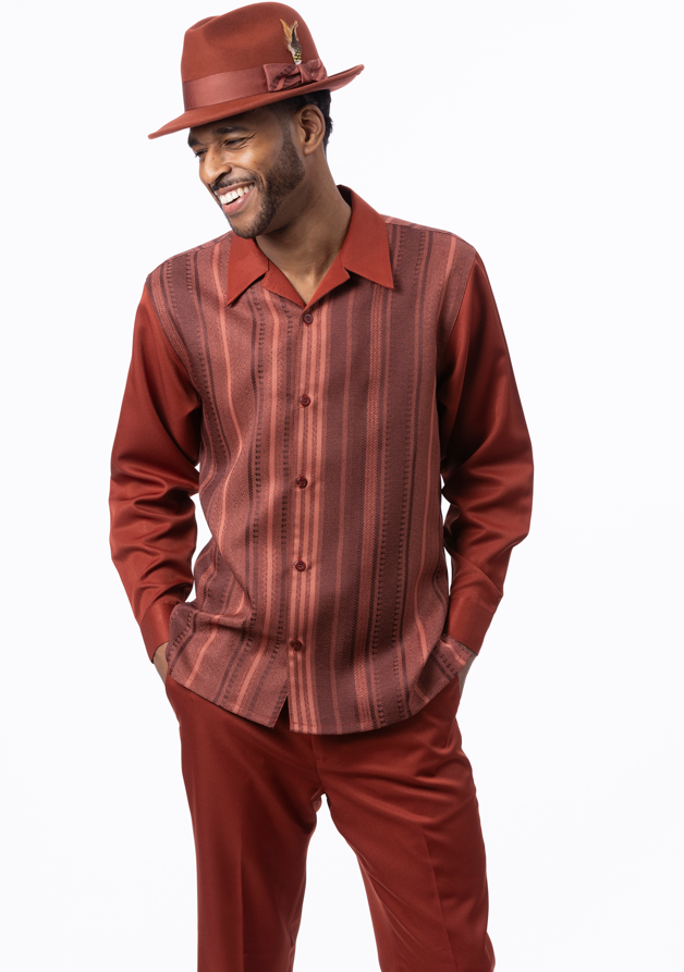 Montique 2552 mens walking suits cognac striking vertical woven stripe design 2 piece leisure suit. Mens Leisure Suits is a full cut, long sleeve with vertical stripe top. Leisure suits has open collar with button down style. Vertical woven strip design shirt with solid sleeves and solid pants.