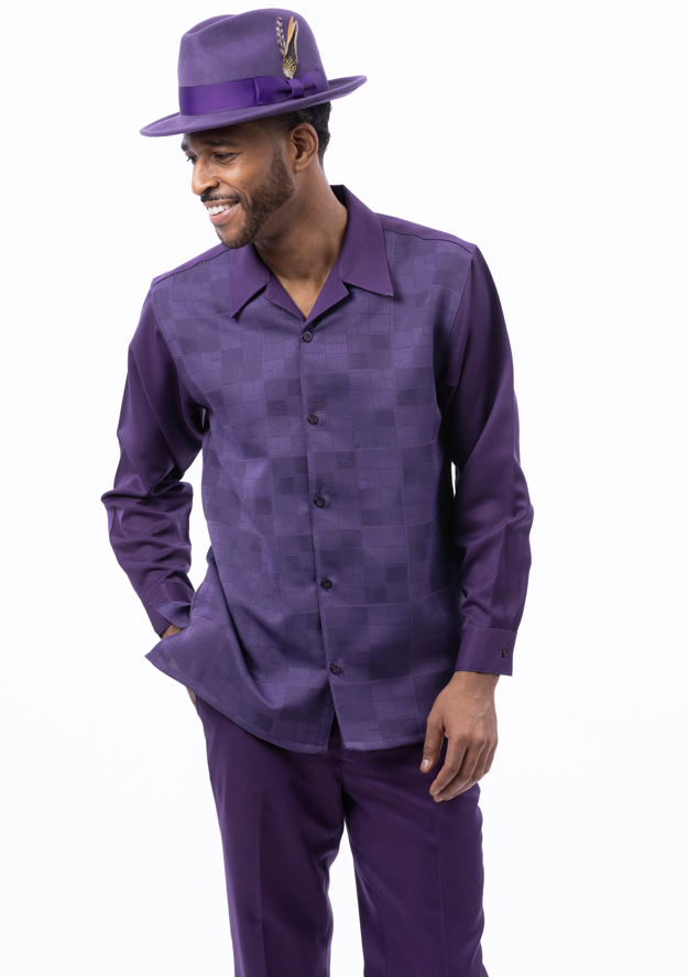Montique 2580 mens walking suits has checkerboard jacquard pattern 2 piece leisure suit. Mens Leisure Suits is a full cut, long sleeve with checkerboard jacquard pattern top. Leisure suits has open collar with button down style. Vertical woven strip design shirt with solid sleeves and solid pants.