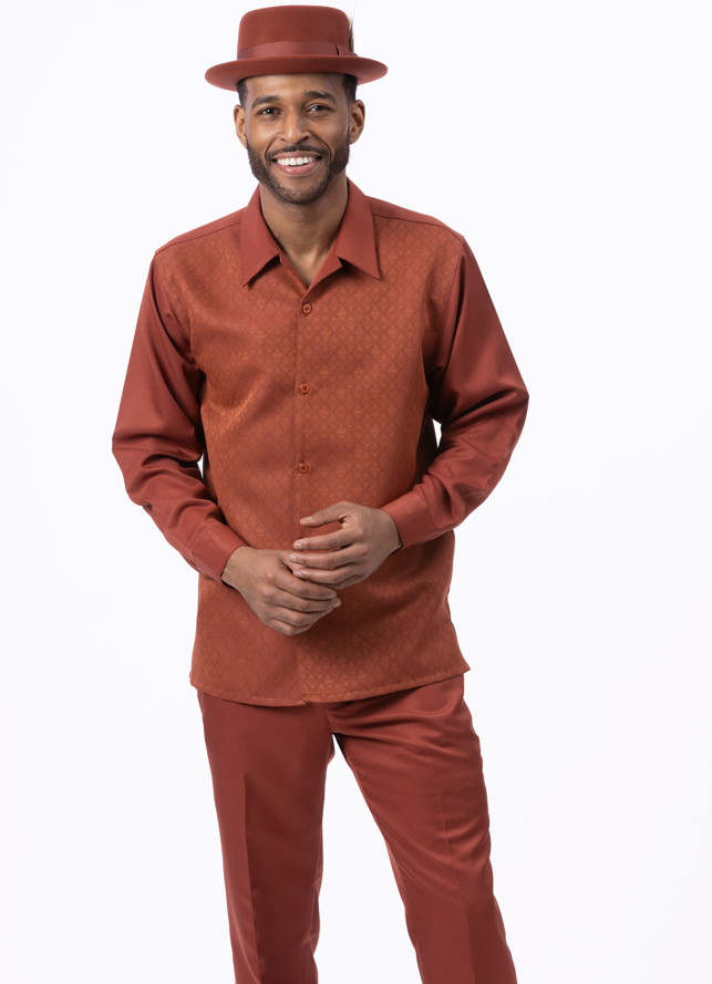 Montique 2582 mens walking suits has diamond lattice jacquard texture design 2 piece leisure suit. Mens Leisure Suits is a full cut, long sleeve with diamond lattice jacquard texture pattern top. Leisure suits has open collar with button down style. Vertical woven strip design shirt with solid sleeves and solid pants.