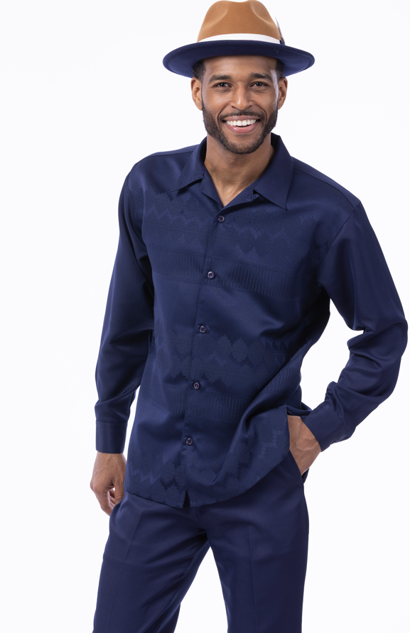 Montique 2596 mens walking suits navy tone-on-tone diamond and stripe jacquard design 2 piece leisure suit. Mens Leisure Suits is a full cut, long sleeve with diamond and stripe jacquard top. Leisure suits has open collar with button down style. Horizontal diamond and stripe jacquard design shirt with solid sleeves and solid pants.