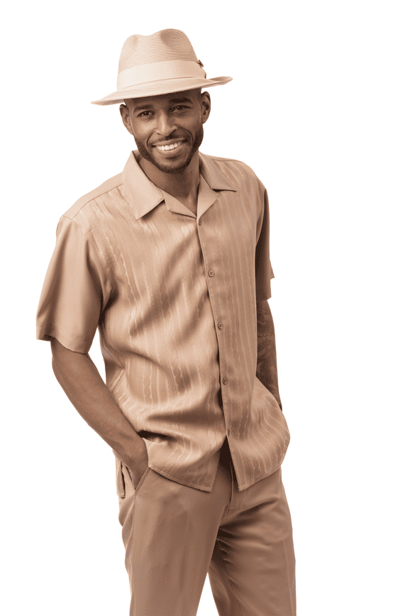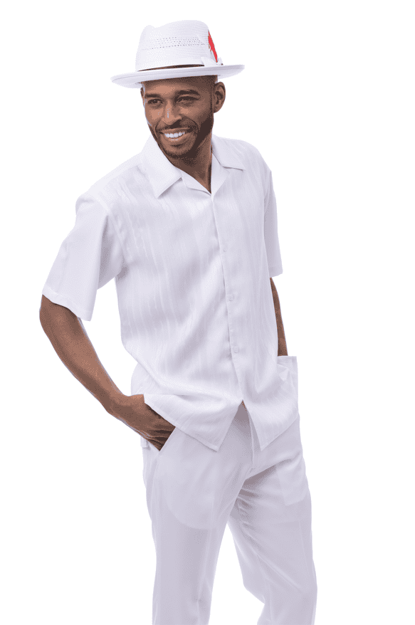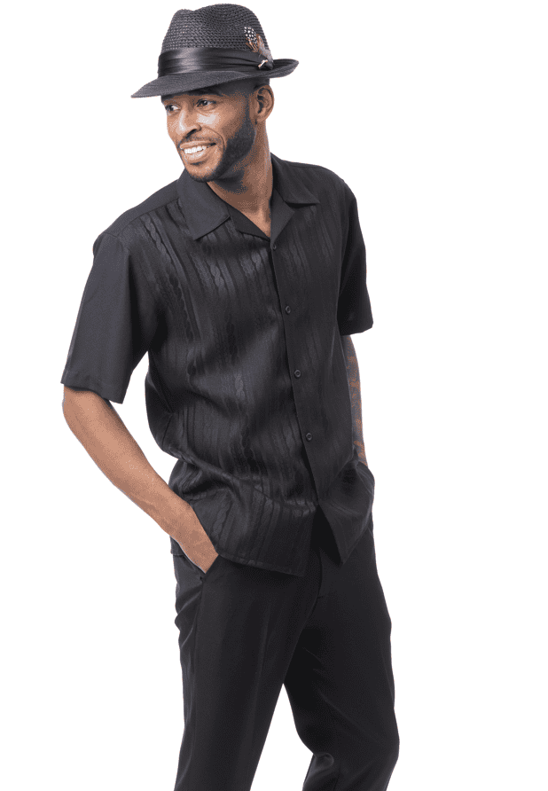 Montique 2608 mens walking suits solid tone-on-tone cable knit 2 piece short sleeve mens leisure suits. Mens Leisure Suits is a full cut, short sleeve with tone-on-tone cable knit pattern top. Leisure suits has open collar with button down style. Solid tone-on-tone shirt with solid sleeves and solid pants.