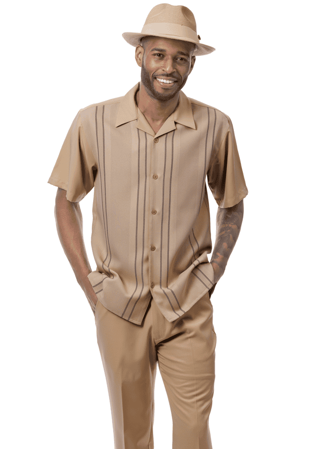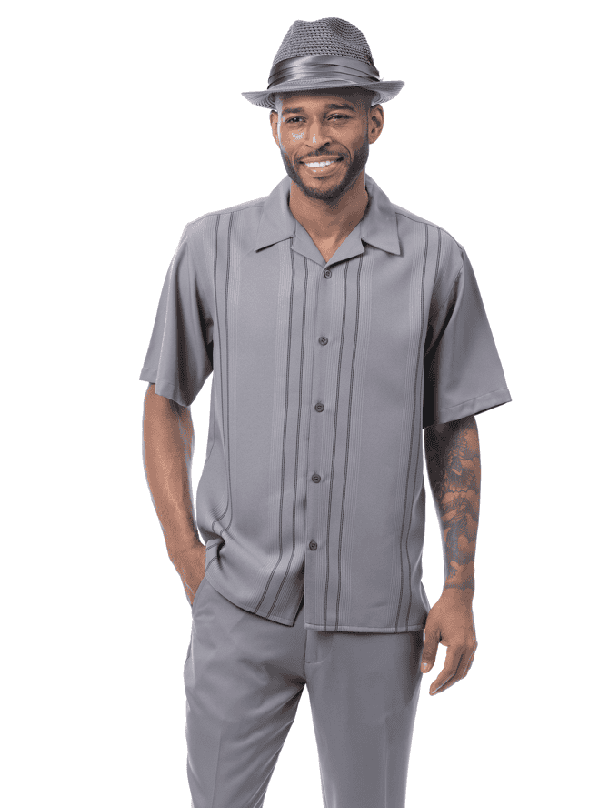 Montique 2615 mens walking suits textured vertical line panel pattern 2 piece short sleeve mens leisure suits. Mens Leisure Suits is a full cut, short sleeve with textured vertical line panel pattern top. Leisure suits has open collar with button down style. Textured vertical line panel shirt with solid sleeves and solid pants.
